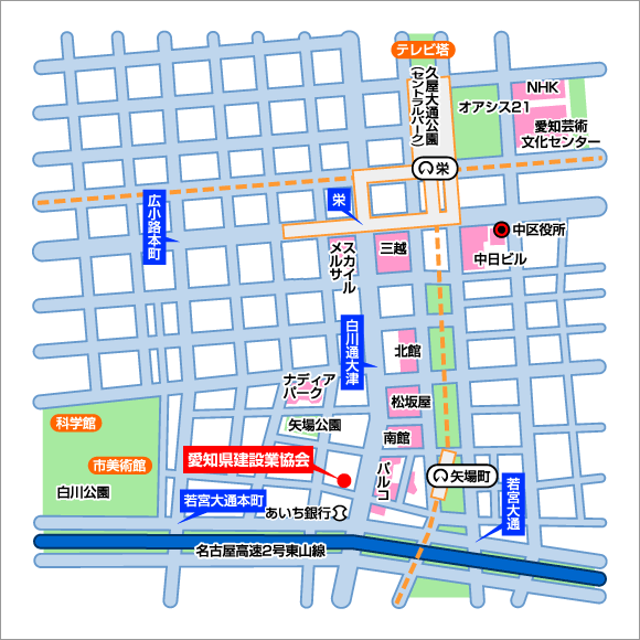 地下鉄名城線「矢場町」駅下車、4番出口より徒歩2分 ●名古屋駅から、地下鉄東山線「栄」で名城線に乗り換え、「矢場町」で下車。 ●金山駅から、地下鉄名城線に乗り、「矢場町」で下車。 ●市役所駅から、地下鉄名城線に乗り、「矢場町」で下車。