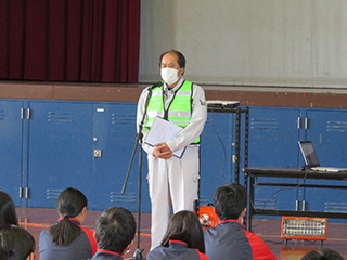 授業は、この機会に災害への関心を持ってもらうため、最初に体育館で「災害に備える」と題して、愛知県建設局土木部建設企画課職員による出前講座が開かれました。