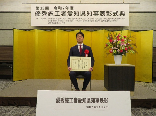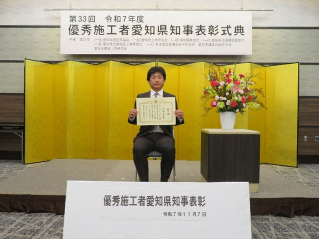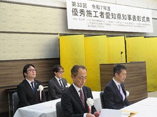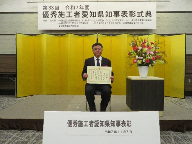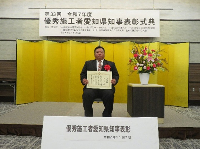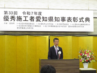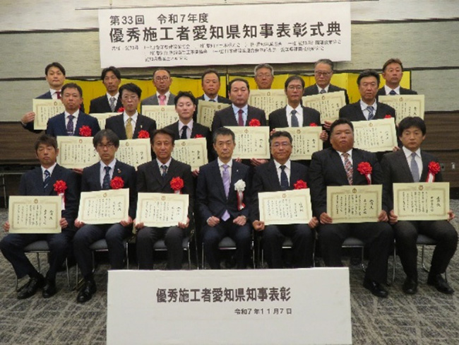 令和7年11月7日(金)午後2時から名古屋市中区のアイリス愛知で、優秀施工者を表彰する第33回愛知県知事表彰式典が開催されました。