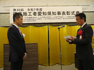 令和7年11月7日(金)午後2時から名古屋市中区のアイリス愛知で、優秀施工者を表彰する第33回愛知県知事表彰式典が開催されました。